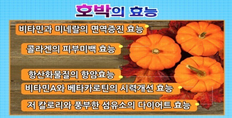 호박의 당분은 소화가 잘 되어서 병 후에 회복기의 체력회복에도 좋으며 세균감염을 예방합니다.비타민A와 비타민E는 지용성이기에 기름과 함께 조리한다면 흡수율을 증가시킵니다.