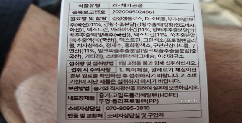 부추분말 국산 11%,강황추출분말 인도네시아산,덱스트린 11%,아라비아검 11%,양배추추출분말,쑥추출분말,그린색소,치자청색소,정제수,홍화황색소,구연산삼나트륨,구연산,밀크씨슬추출분말,스테아린삼나그네슘,이산화규소를 함유하고 있습니다.